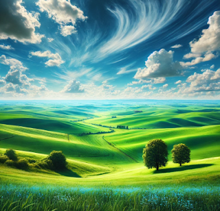 | 끝없이 펼쳐진 푸른 초원, 밝은 하늘과 구름이 어우러진 평화롭고 기회의 느낌을 주는 풍경 |